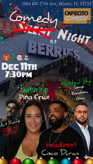 Francisco “Cisco” Duran (b. 1986) is a stand-up comedian and entertainer from Miami, Florida. Cisco Duran moved to Miami at the age of 4 and started performing comedy at age 21. By age 23, Cisco was a finalist for Florida's Funniest Comedian and was subsequently named as one of the Top Ten Comics by Sunpost.com.Cisco has been featured on Kevin Hart's show on Comedy Central "Hart of the City, HBO MAX Entre Nos “The Winners”, AfroTV Comedy Special, AXS TV on Gotham Live, also as part of Ha Comedy Festival (San Antonio, Texas), Big Sky Comedy Festival (Billings, Montana).